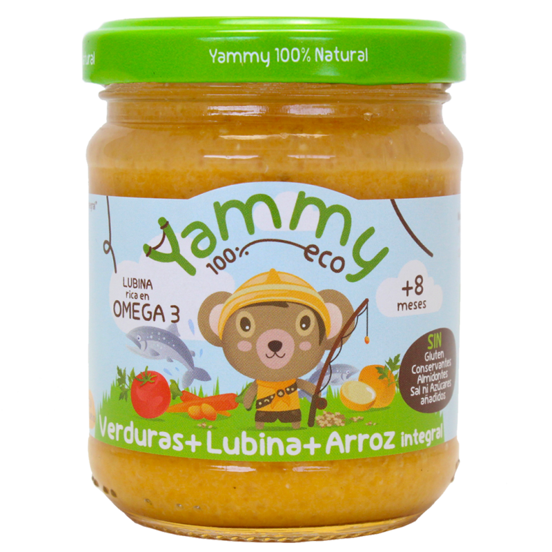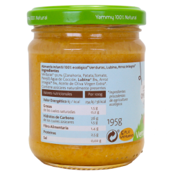 INGREDIENTES: Verduras* 51,3% (Zanahoria, Patata, Tomate, Perejil), Agua de Cocción*, Arroz Integral* 9,7%, Lubina* 8%, Aceite de Oliva Virgen Extra* 1%.
