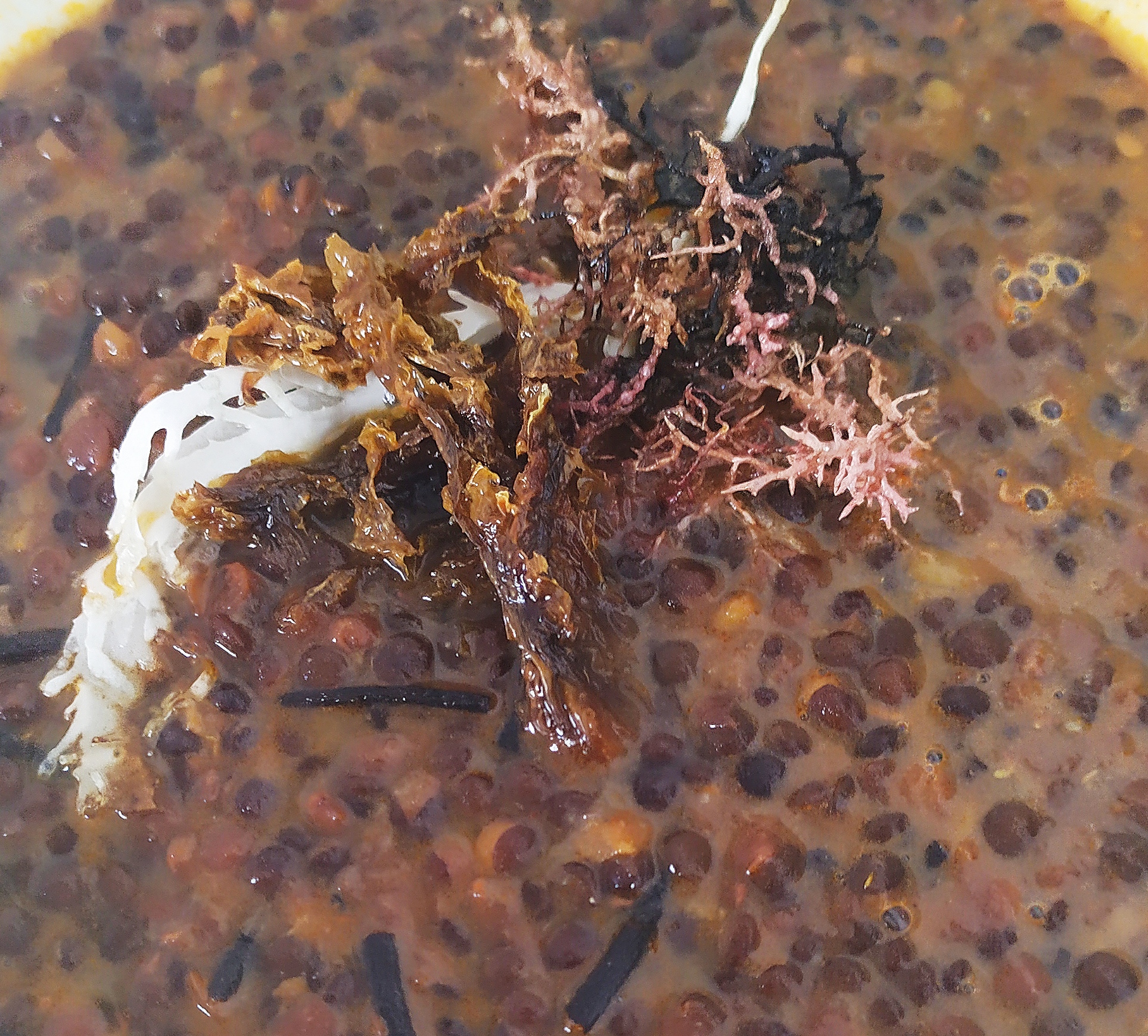 3. Añadimos las lentejas y mezclamos bien, en este punto añadimos las algas que deseamos (wakame, kombu, Iziki...), rehogamos un segundo y añadimos el agua (30% agua de mar /70 agua mineral)