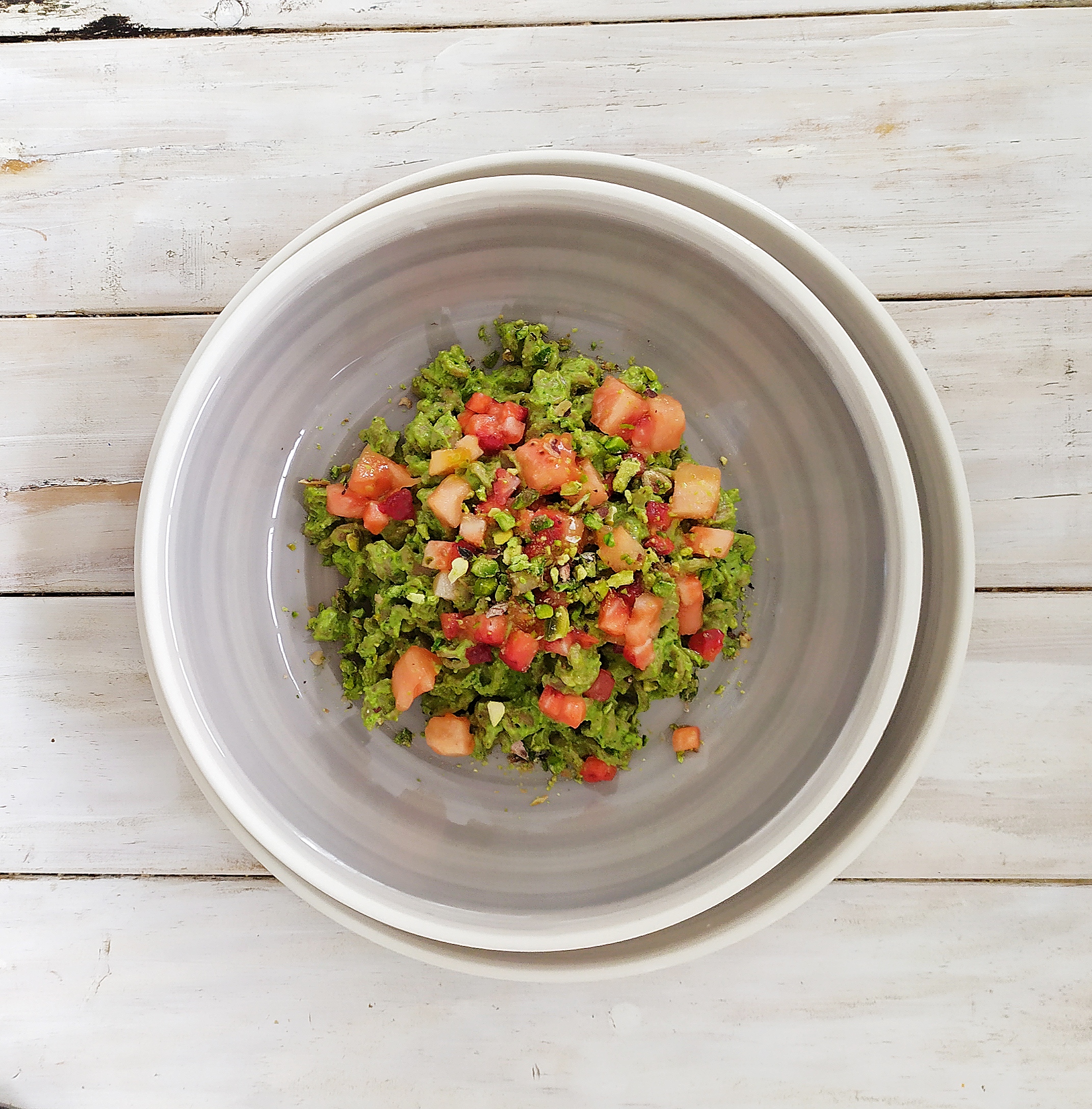 Ya en e plato es el momento de añadir el tomate y las fresas. Por ultimo espolvoreamos algunos pistachos triturados ( estos podéis tostarlos un poco para potenciar su sabor)