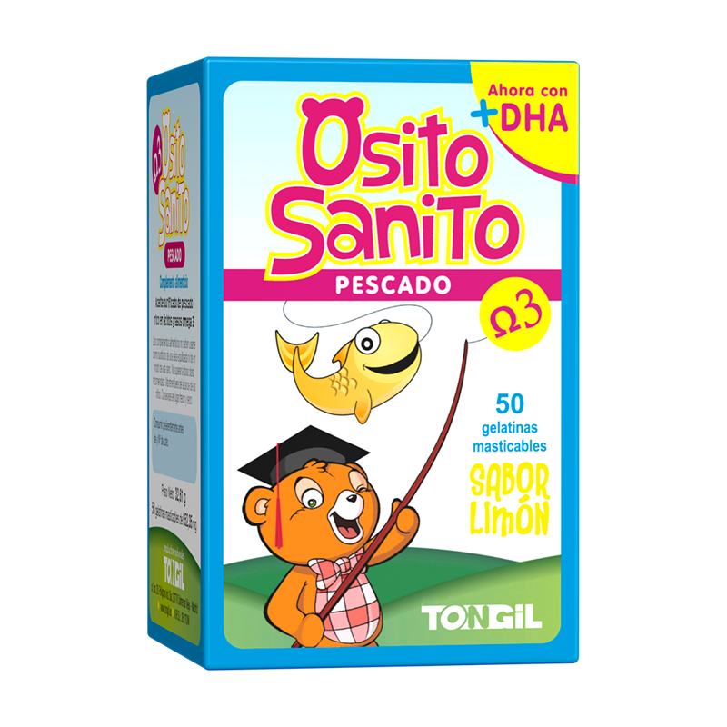 INGREDIENTES: aceite purificado de pescado azul salvaje (18% EPA Y 12% DHA) 500 mg y aceite esencial de frutas. Gelatina masticable: glicerol, gelatina, celulosa microcristalina, almidon de mazi, aceite esencial de frutas, oxido de hierro y sucralosa. Modo de empleo: tomar dos gelatinas masticables al dia, preferentemente con las comidas.Las gelatinas se pueden masticar y tragar o puede tomarse simplemente el aceite contenido, segun la preferencia y edad del niño. A partir de 0 años.